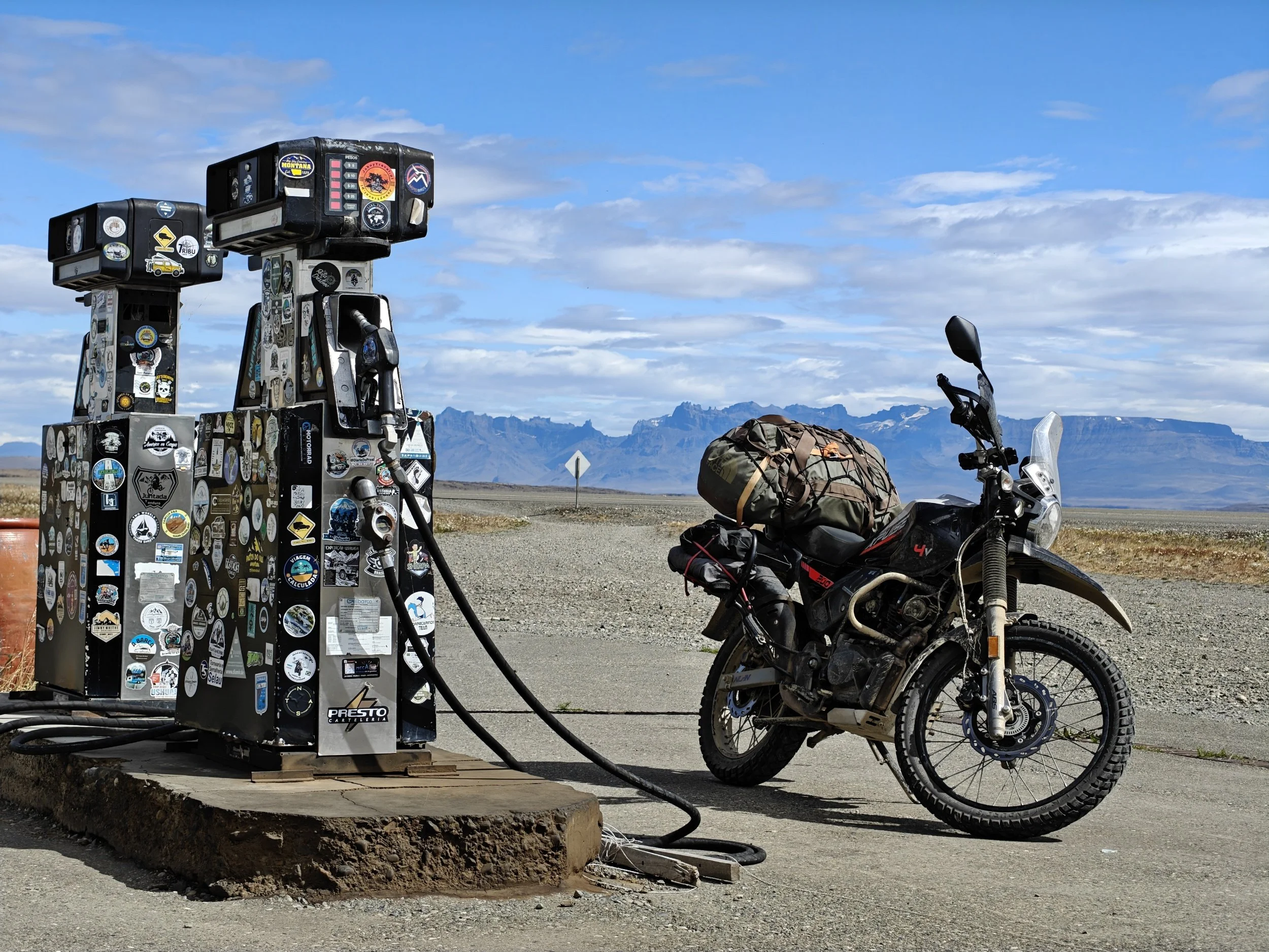 Bensinstasjonene som fantes, var enkle bensinpumper satt opp ved avsidesliggende kafeer, tildekket av stickers fra forbipasserende, og med varierende tilgjengelighet av bensin. Enkelte var stengt og pyntet med spindelvev. Her i traktene måtte man fylle når man hadde muligheten.