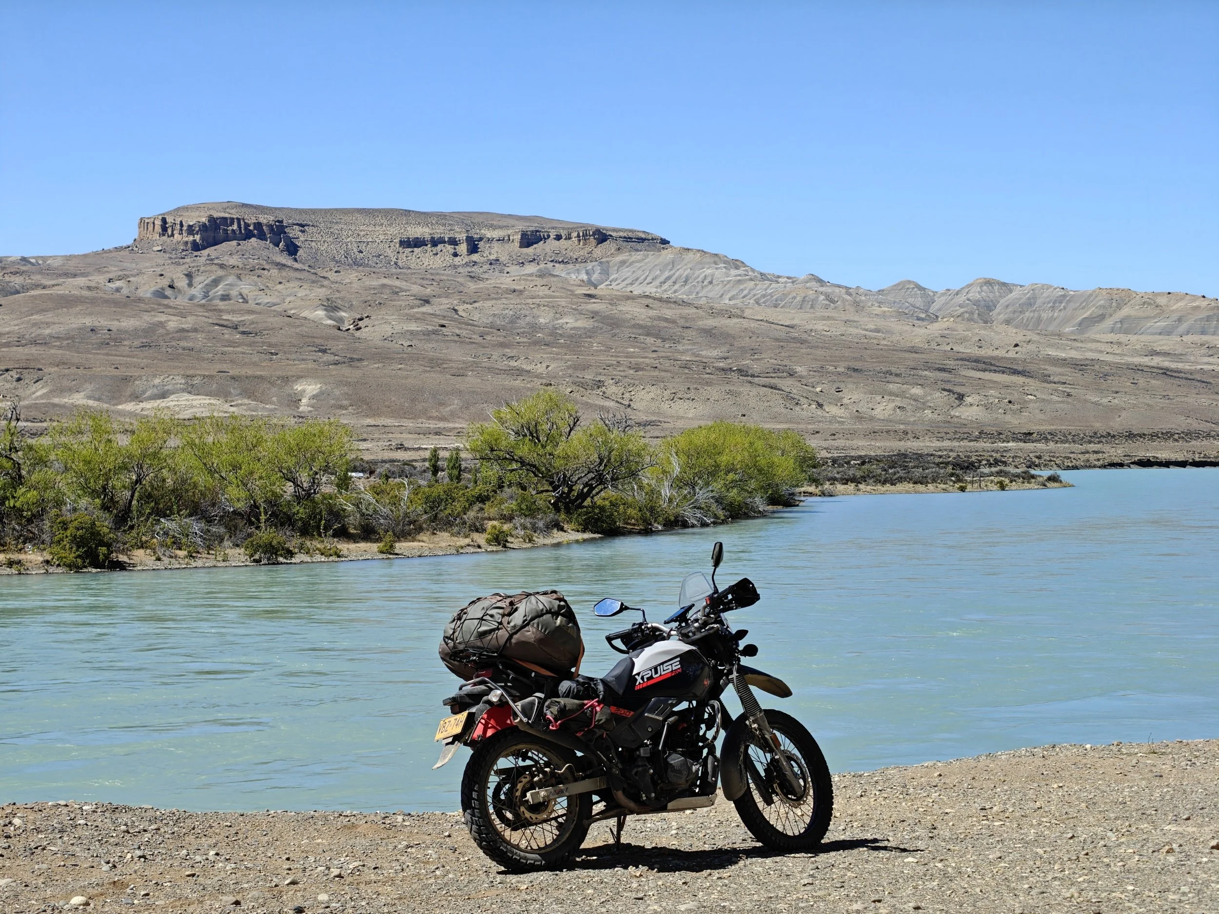 Det ble umiddelbart flatere på den argentinske siden. Små åser og daler dekket av gress. Store elver og blågrønne innsjøer. Og enorme avstander med veldig lite imellom. Før jeg forlot Chile hadde jeg gått til anskaffelse av en ekstra bensinkanne slik at jeg skulle ha tennvæske til å fyre et bål når sykkelen gikk fri for bensin.