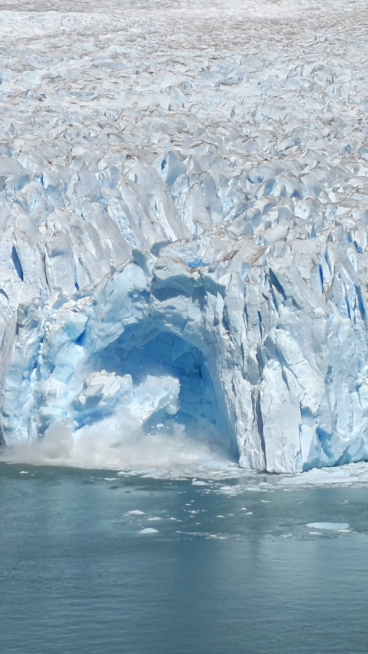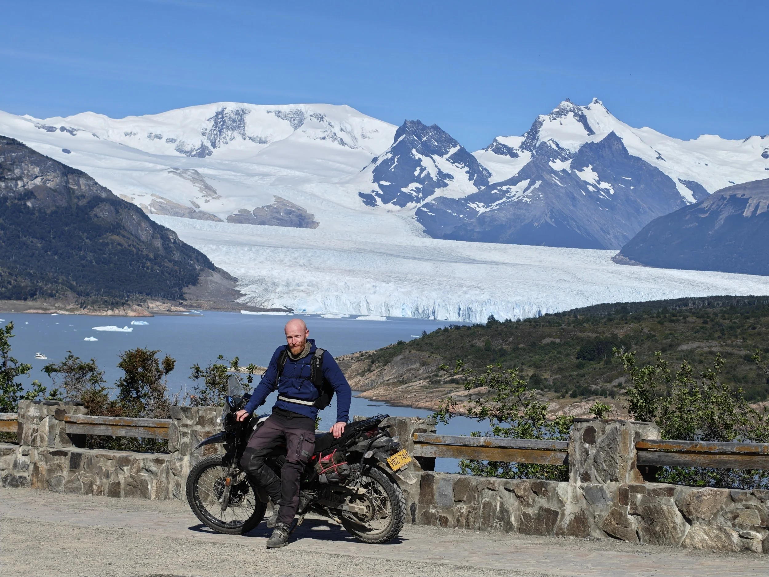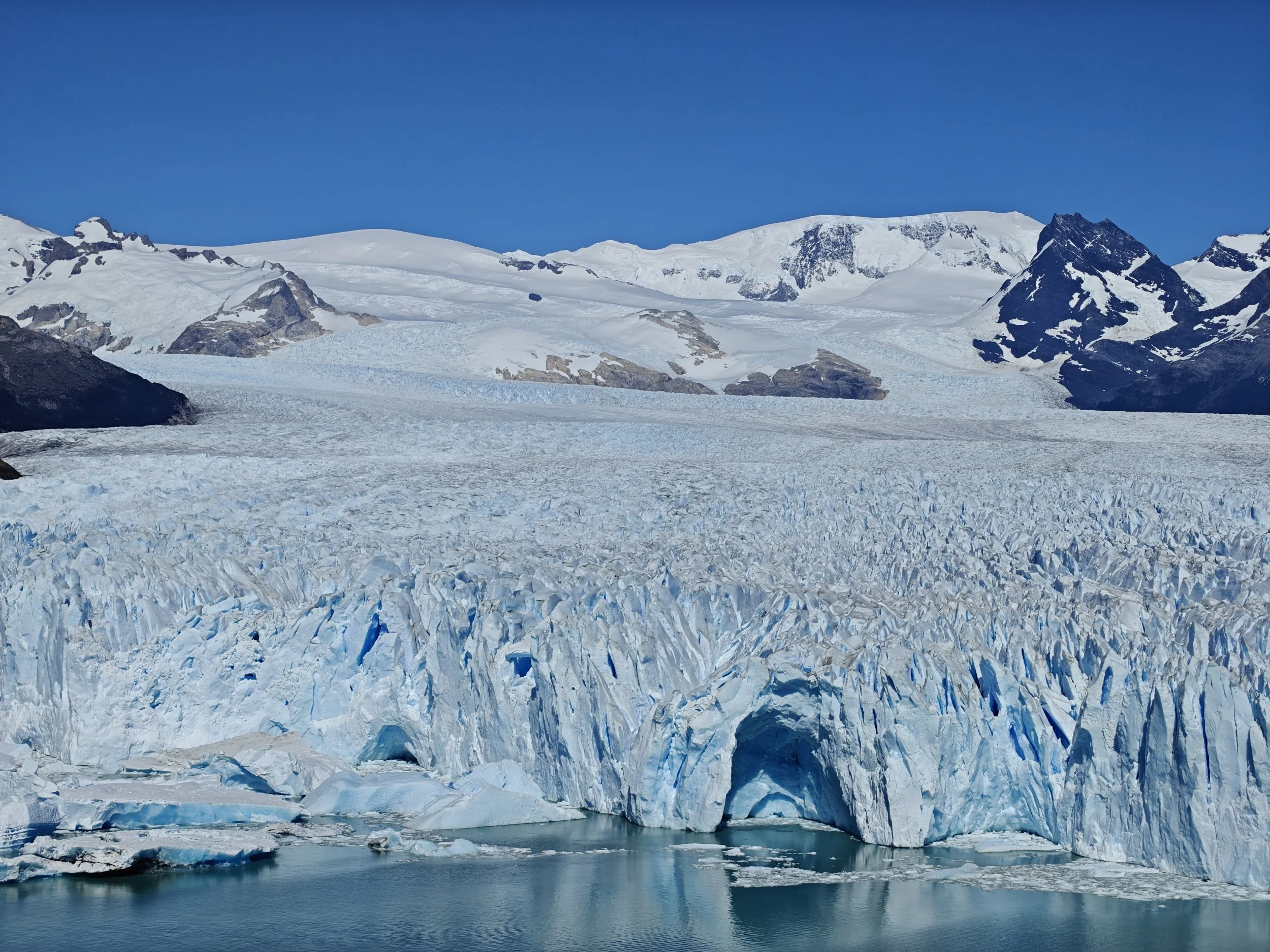Isbreen strakte seg ned fra fjellet, gjennom hele dalen og ut i vannet nedenfor, hvor det fra den 70 meter høye iskanten stadig kalvet store isblokker. Det var nesten hypnotiserende å følge med på lyden breen lagde, med høye bulder og brak, samt vente på at nok en stor isklomp skulle falle i slow motion mot vannet. Her kunne jeg blitt stående i timevis og bare stirret, men de uunngåelige turbussene fulle av turister begynte å dukke opp, og det ble litt vel folksomt for min del. Så jeg satte meg på sykkelen og kjørte tilbake til byen i det urimelig gode været.