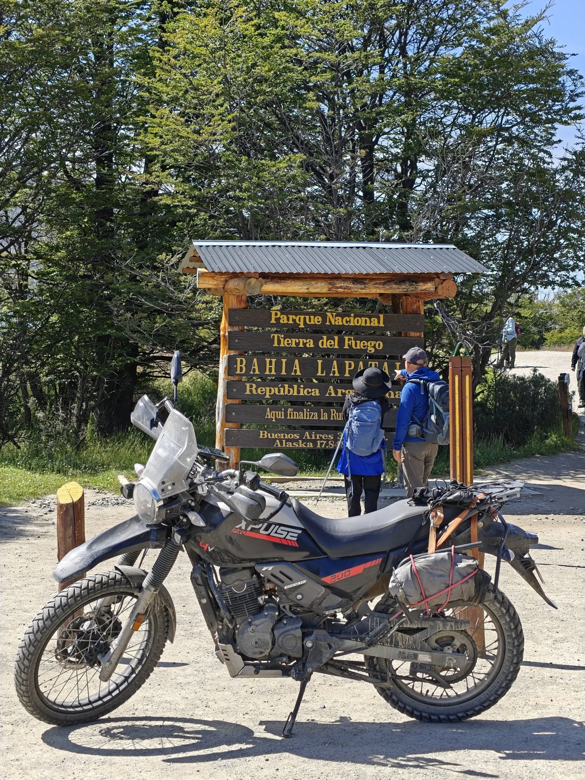 Veis ende lå i Tierra del Fuego nasjonalpark, og var ved en støvete parkeringsplass overfylt av turister, de fleste på dagstur fra ett av de mange cruiseskipene som lå til kai i Ushuaia. Det var i det hele tatt temmelig undervelmende å komme frem. Jeg tuslet de to hundre meterne rundt en liten gangvei laget for at turistene skulle ha noe å ta seg til når de først kom ned hit. Deretter prøvde jeg å ta et bilde med motorsykkelen foran skiltet som markerer sluttpunktet, men den ene turisten etter den andre skyflet inn foran for å ta sine egne bilder, så det ble ikke stort av den seansen heller. Det var alltid slik med endepunktene. Som om reise-gudene ville påminne en om at endepunktet ikke var det viktige, men veien dit som var poenget.