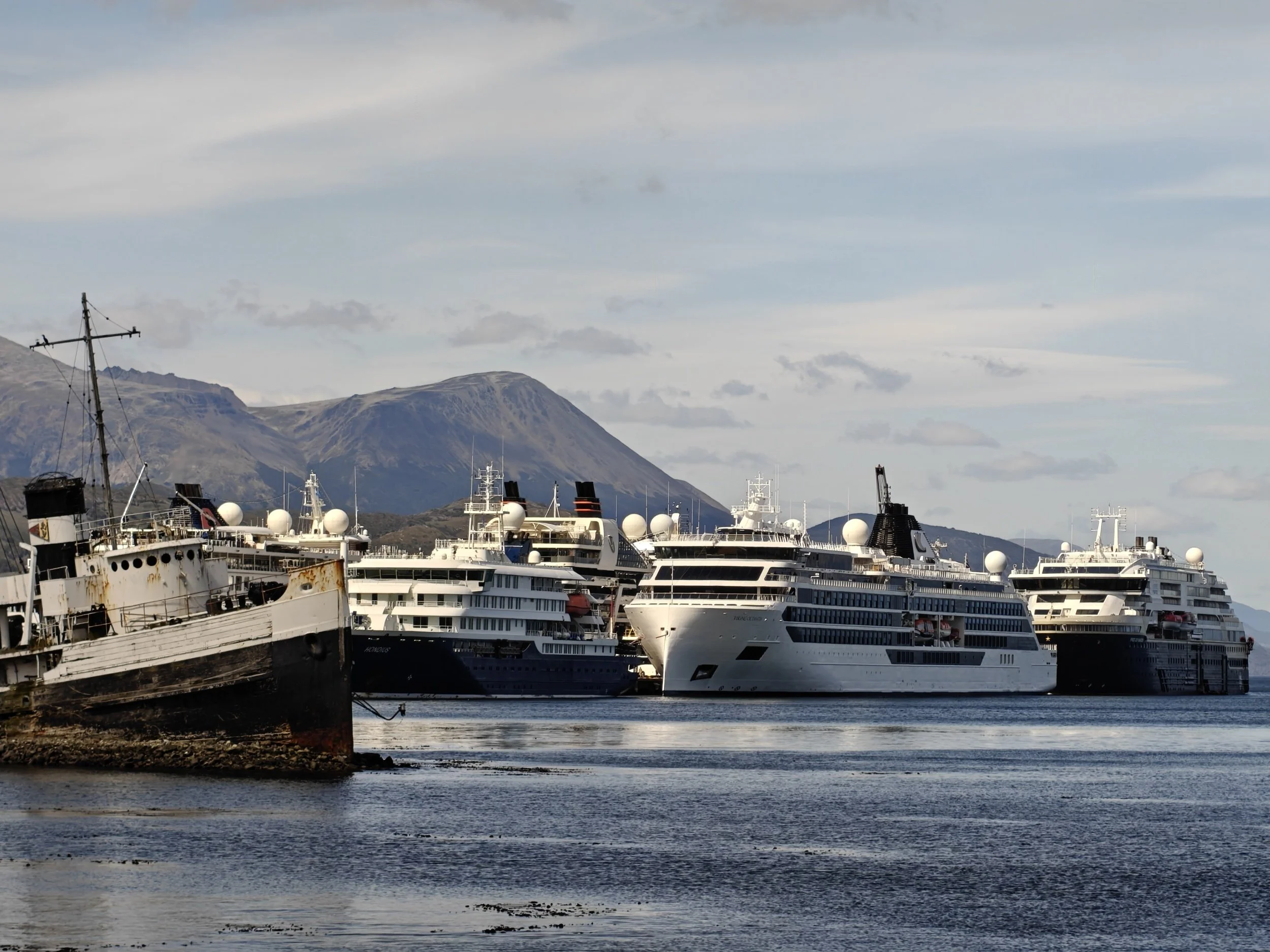 Nærmere Ushuaia ble det mer fjell og daler, snø og is på toppene, og det kalde havet i Beagle Kanalen kom til syne. I havnen lå det ene cruiseskipet etter det andre, og den sørligste byen på denne turen strakte seg ut langs kysten.